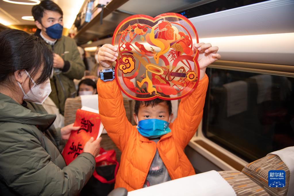 當日,G1008次愛(ài)心專(zhuān)列搭載著(zhù)500多名長(cháng)期在深圳工作的文明實(shí)踐志愿者從深圳北站駛往武漢。G1008次列車(chē)是深圳鐵路部門(mén)今年春運開(kāi)出的第6趟愛(ài)心專(zhuān)列,暖心助力深圳地區的文明實(shí)踐志愿者和城市奮斗者及家人順利回家過(guò)年。新華社記者 毛思倩 攝