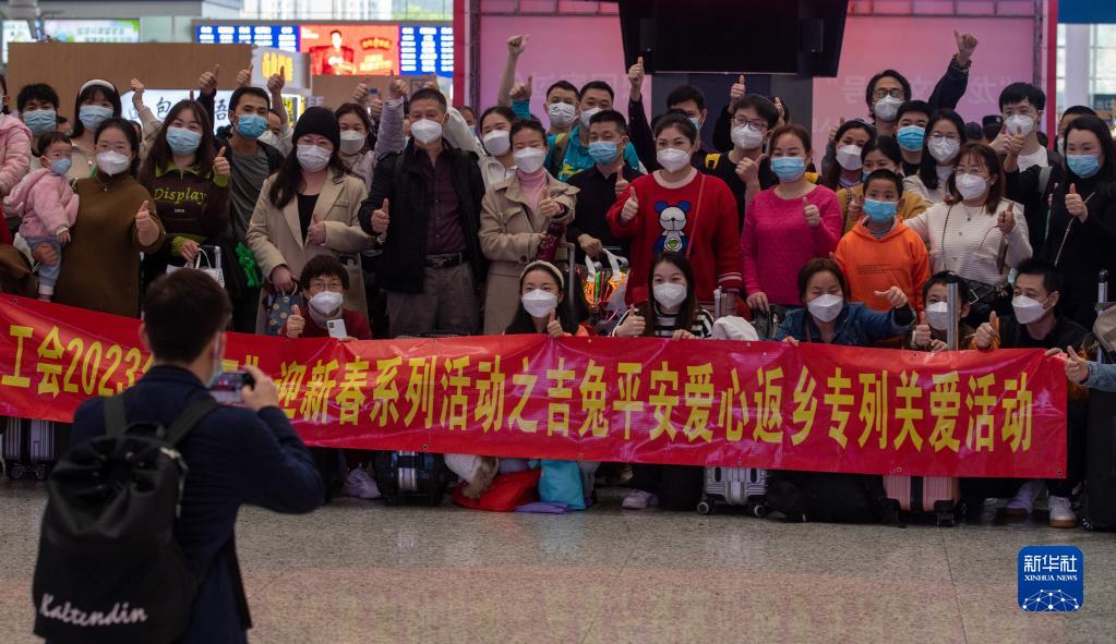 當日,G1008次愛(ài)心專(zhuān)列搭載著(zhù)500多名長(cháng)期在深圳工作的文明實(shí)踐志愿者從深圳北站駛往武漢。G1008次列車(chē)是深圳鐵路部門(mén)今年春運開(kāi)出的第6趟愛(ài)心專(zhuān)列,暖心助力深圳地區的文明實(shí)踐志愿者和城市奮斗者及家人順利回家過(guò)年。新華社記者 毛思倩 攝