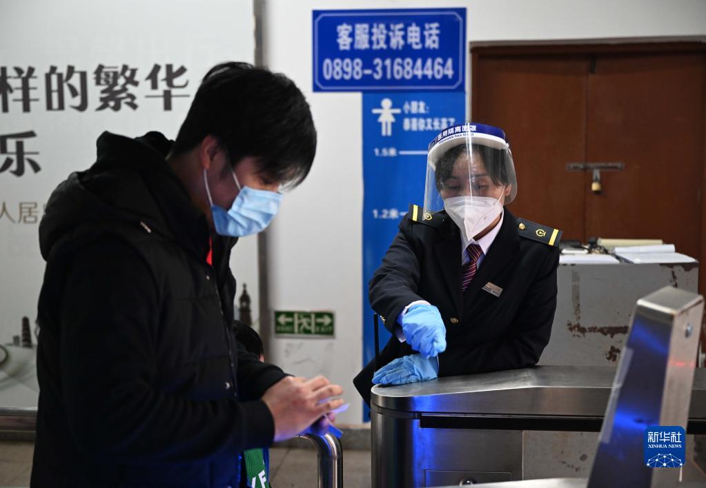 在廣東徐聞的粵海鐵路輪渡北港碼頭客運樓,肖玉鳳(右)協(xié)助旅客刷票通過(guò)閘機(1月8日攝)。