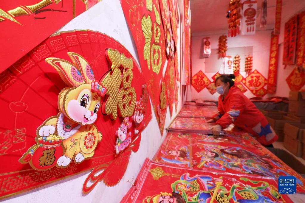 1月13日,在河南省焦作市溫縣趙堡鎮趙堡村年貨市場(chǎng),商戶(hù)在整理春聯(lián)、福字等飾品。