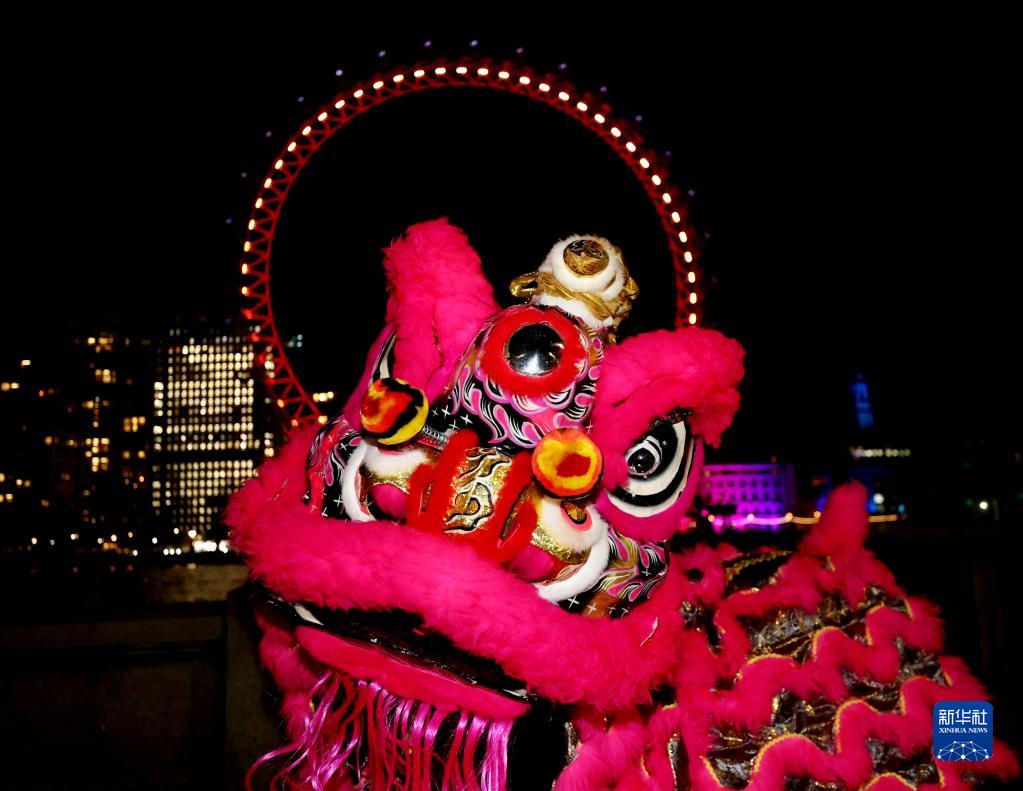 1月13日,在英國倫敦,演員在亮起紅色燈光的“倫敦眼”前表演舞獅。