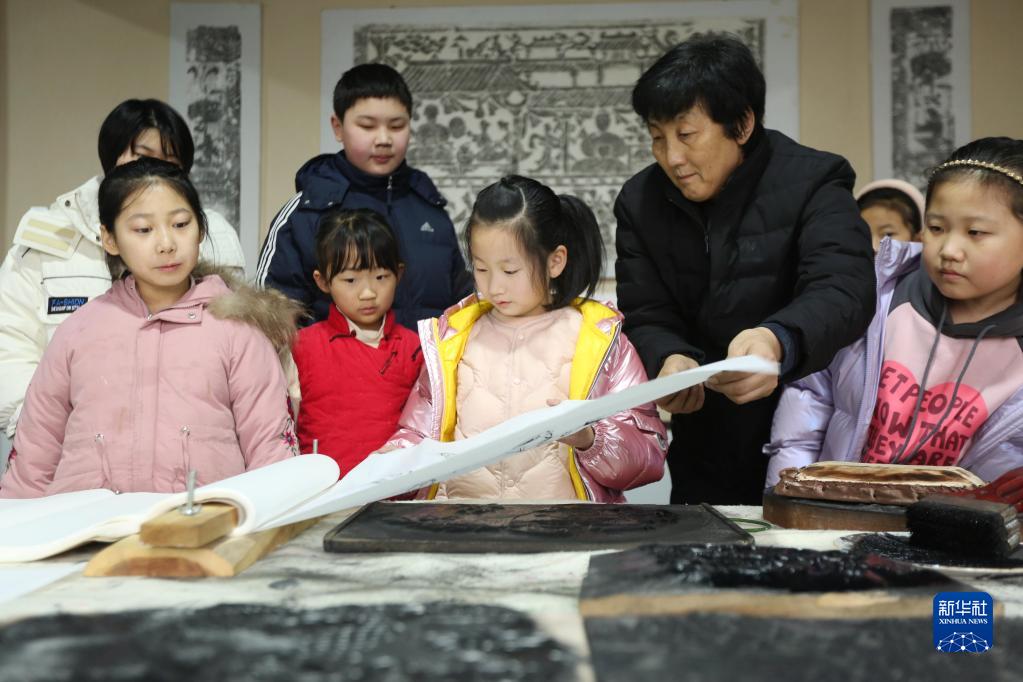 1月13日,在山東省臨沂市沂南縣博物館,木版年畫(huà)傳承人(右二)給孩子們講授木版年畫(huà)制作技藝。