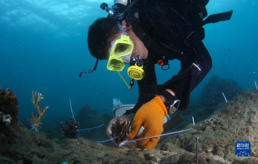 在海南省三亞市亞龍灣相關(guān)海域,潛水員在海底移植珊瑚(2022年11月17日攝)。
