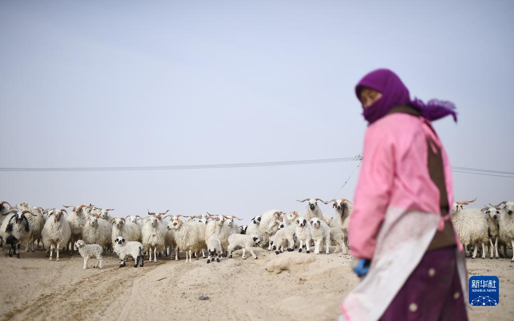 1月13日,在青海湖湖東種羊場(chǎng),一名牧工將羊群趕往飲水處。