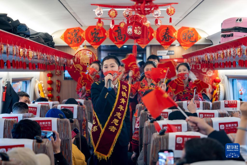1月13日,在丹東開(kāi)往上海虹橋的G1230次列車(chē)上,列車(chē)乘務(wù)人員為旅客準備了一場(chǎng)熱鬧的高鐵聯(lián)歡會(huì ),在歡歌笑語(yǔ)中迎接農歷小年。