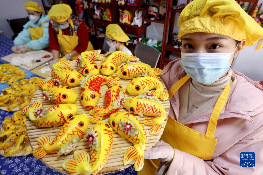 1月13日,山東省棗莊市龍山路街道居民在展示制作的傳統“面魚(yú)”。