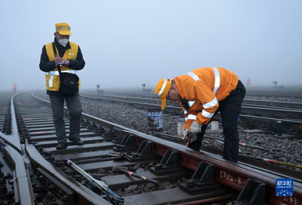 1月13日,中國鐵路上海局集團有限公司合肥工務(wù)段工作人員在合肥東站進(jìn)行軌道維修作業(yè)。