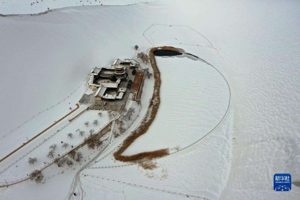1月13日在甘肅省敦煌市鳴沙山月牙泉景區拍攝的雪景(無(wú)人機照片)。
