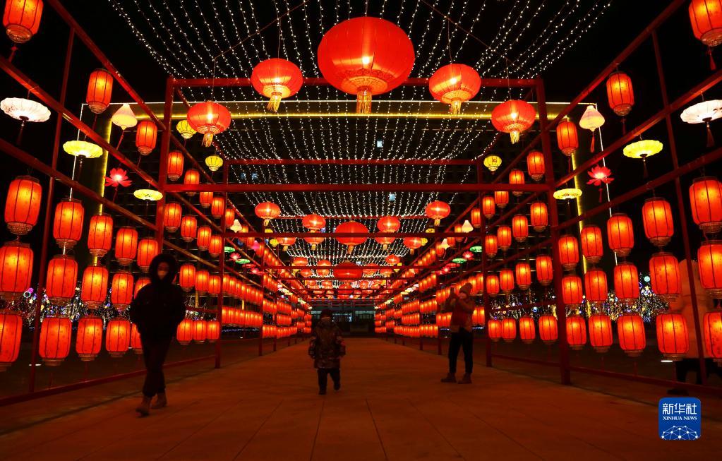 1月13日,市民在甘肅省定西市一處廣場(chǎng)欣賞迎春燈飾。