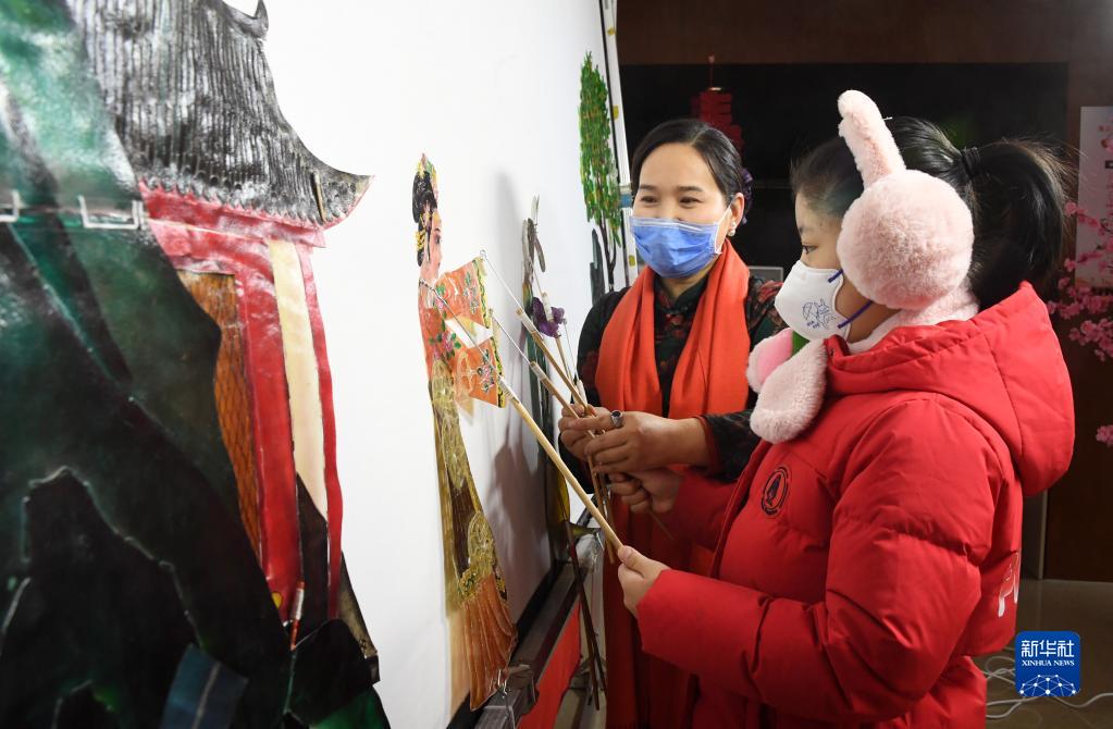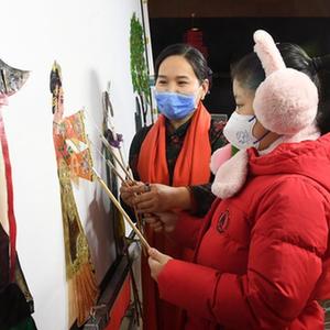 1月14日,在海淀北部文化中心,小朋友在體驗皮影戲表演。