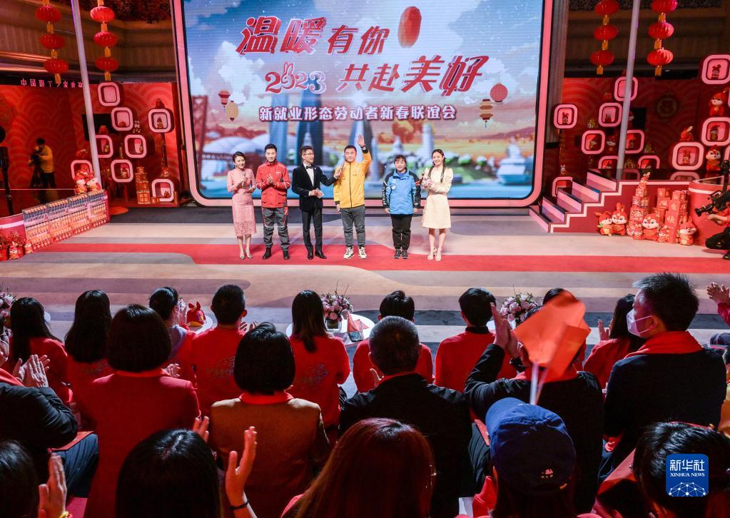 當日,由中華全國總工會(huì )文工團與中國財貿輕紡煙草工會(huì )聯(lián)合主辦的“溫暖有你 共赴美好”新就業(yè)形態(tài)勞動(dòng)者新春聯(lián)誼會(huì )在北京舉辦。聯(lián)誼會(huì )通過(guò)歌曲、舞蹈、相聲、詩(shī)朗誦、鋼琴演奏等藝術(shù)形式,突出喜慶、溫暖、美好的主基調。部分節目還邀請新就業(yè)形態(tài)勞動(dòng)者與演職人員同臺表演,為廣大新就業(yè)形態(tài)勞動(dòng)者送去新春祝福。