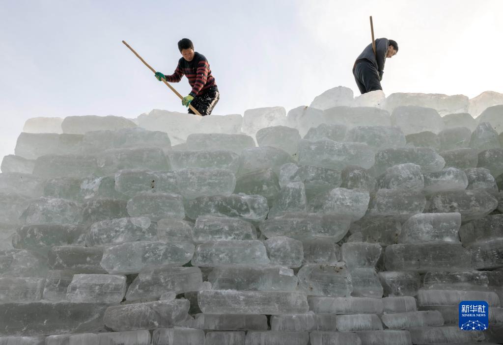 1月14日,河北省唐山市豐南區黑沿子鎮的農民在整理碼放采集的冰塊。