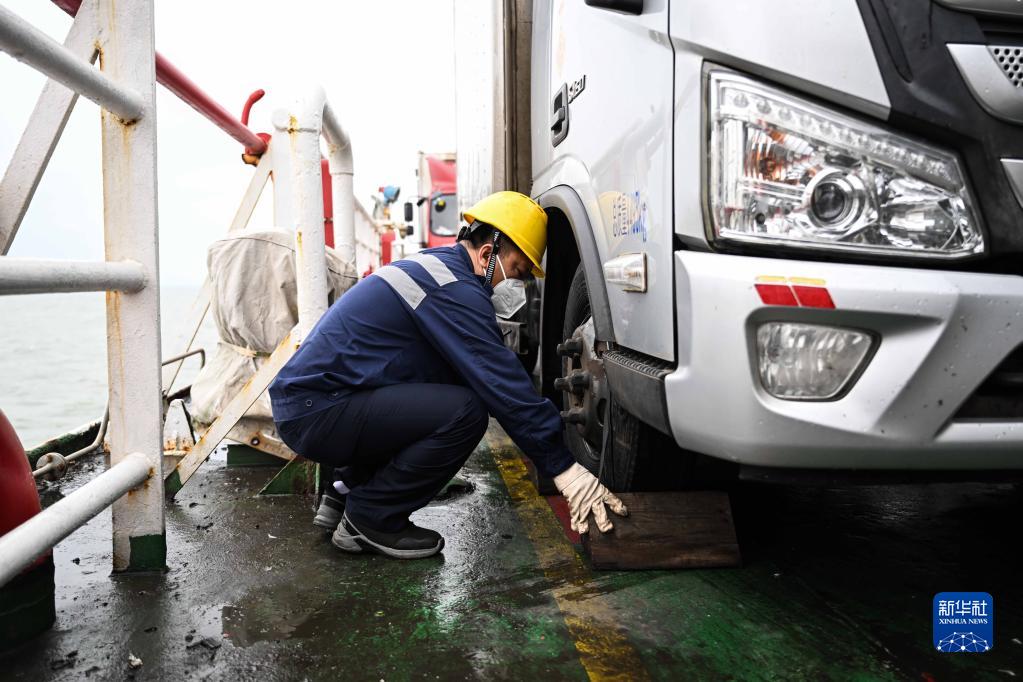 在粵海鐵路輪渡甲板,劉昱給停放的車(chē)輛安放車(chē)輪卡塊(1月8日攝)。