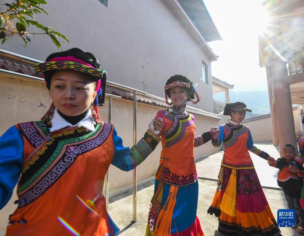 1月12日,阿依布卡(左二)在甘洛的家中和家人一起跳起達體舞。