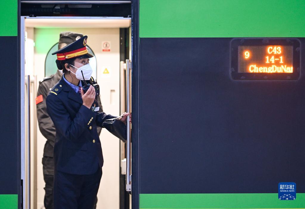 1月11日,在成都火車(chē)南站,阿依布卡(前)呼叫司機關(guān)閉車(chē)門(mén)。