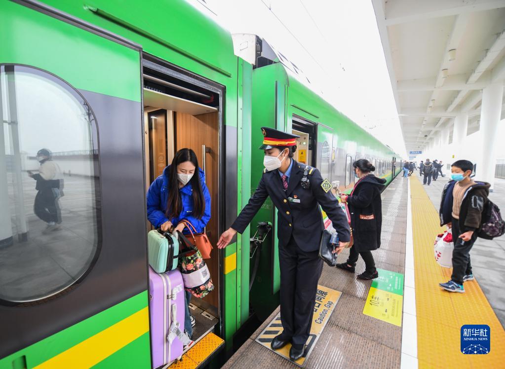1月11日,在樂(lè )山北站,阿依布卡(左二)引導旅客下車(chē)。