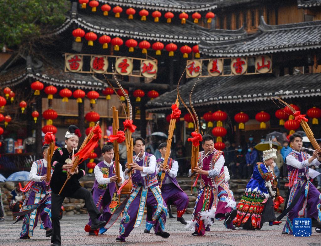 1月14日,村民在貴州省黔東南苗族侗族自治州雷山縣西江鎮表演節目。