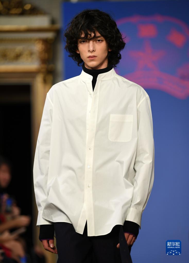 1月14日,一名模特在意大利米蘭男裝周上展示上海灘品牌時(shí)裝。