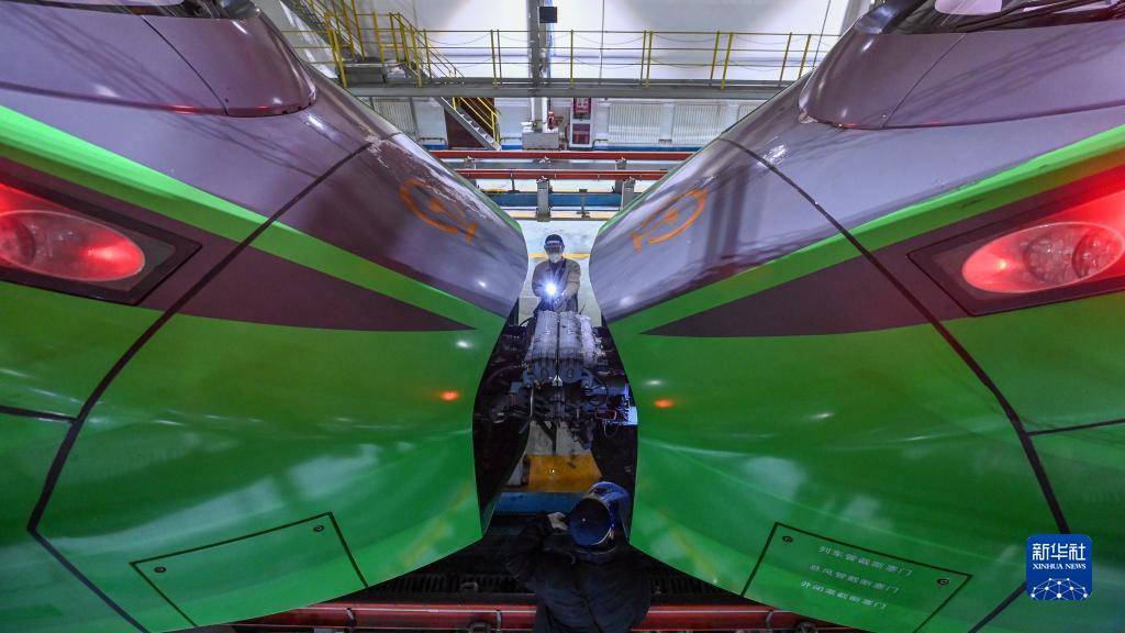 1月14日晚,在烏魯木齊車(chē)輛段動(dòng)車(chē)組運用所,機械師進(jìn)行動(dòng)車(chē)組電鉤狀態(tài)檢查。