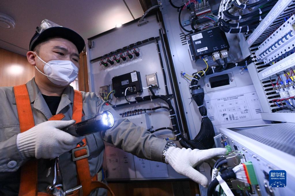 1月14日晚,在烏魯木齊車(chē)輛段動(dòng)車(chē)組運用所,機械師在檢查電氣綜合控制柜。