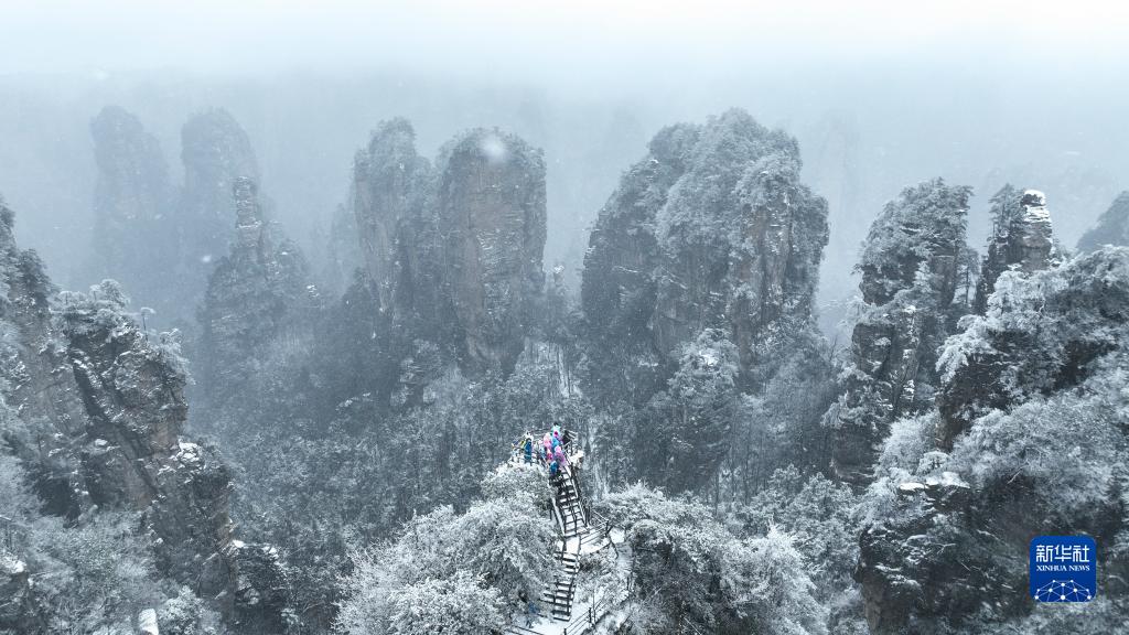 當日,湖南張家界國家森林公園大雪紛飛,銀裝素裹,宛如畫(huà)卷,吸引不少游客。