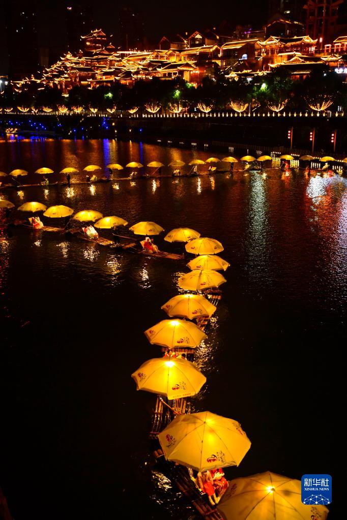當日,在湖北省恩施土家族苗族自治州宣恩縣貢水河上,一場(chǎng)“貢水游龍”迎新春活動(dòng)吸引不少市民游客參與體驗?!柏曀锡垺庇蓴凳畻l竹筏作“龍身”,輔以燈光、音樂(lè ),人們可以在貢水河上“乘龍”觀(guān)賞璀璨夜景,歡樂(lè )迎新春。