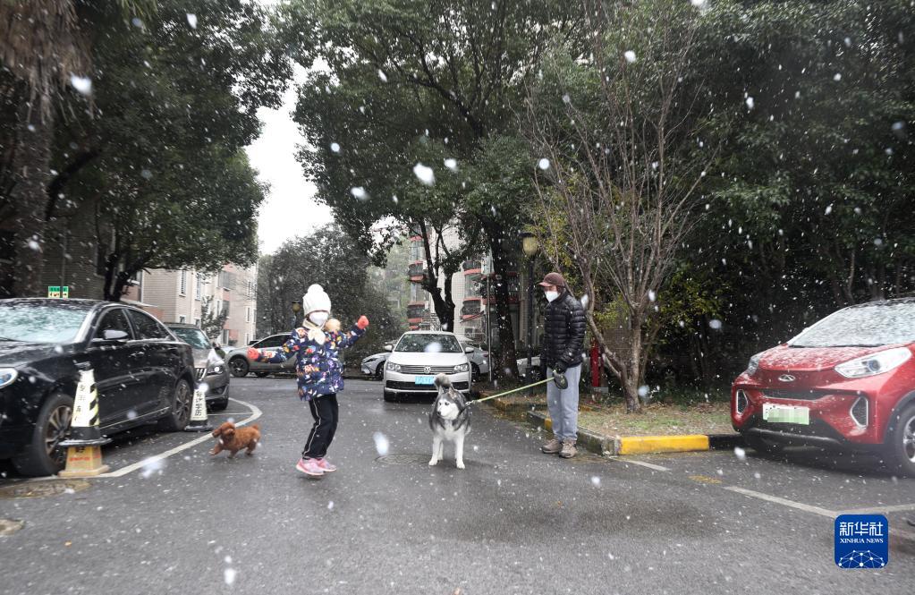 1月15日,在上海閔行區一居民小區,市民在雪中休閑。