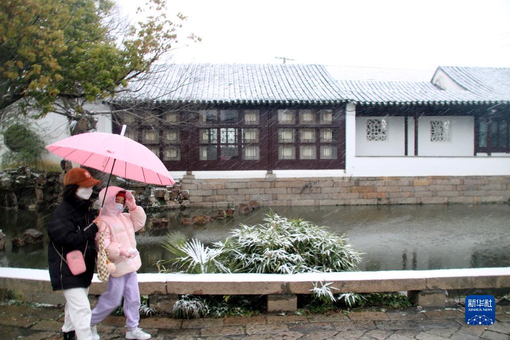 1月15日,游客在雪中的蘇州滄浪亭觀(guān)光游覽。