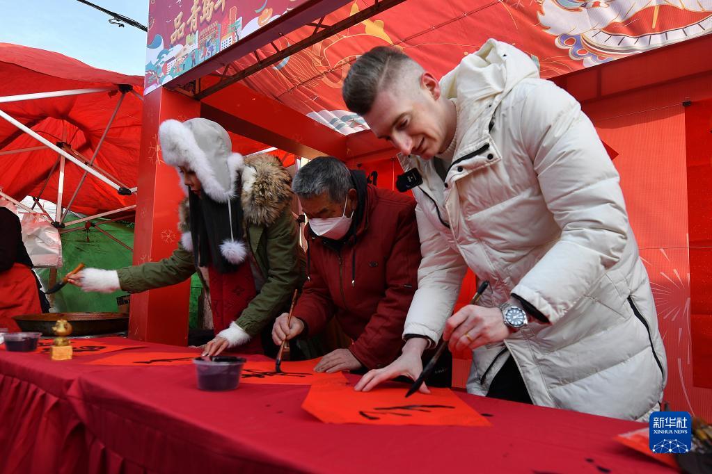 1月15日,在山東省青島市城陽(yáng)區的一場(chǎng)年貨節活動(dòng)上,一名外國游客(右)體驗中國傳統書(shū)法。