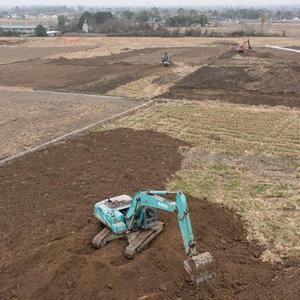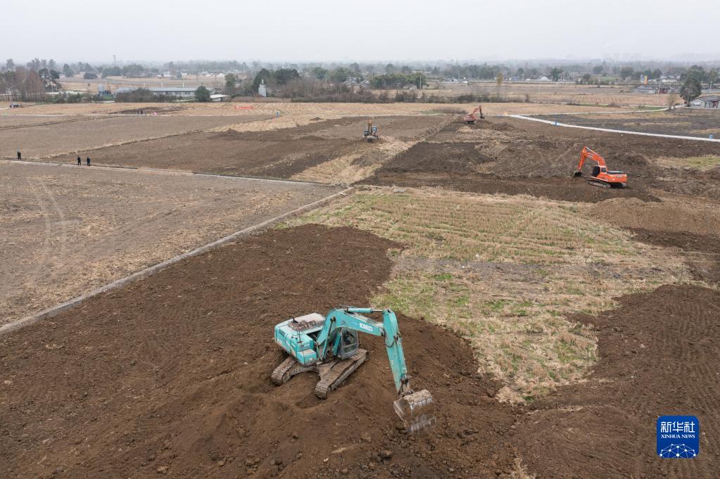 1月14日,在綿竹市孝德鎮清道社區,挖掘機在整治農田(無(wú)人機照片)。
