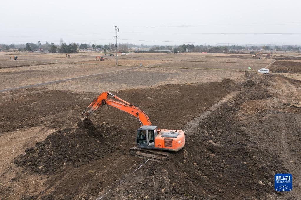 1月14日,在綿竹市孝德鎮清道社區,挖掘機在整治農田(無(wú)人機照片)。