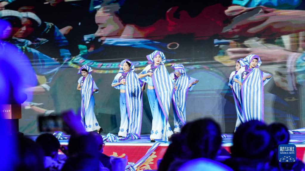 市民在貴陽(yáng)市南明區蘭花廣場(chǎng)年貨節現場(chǎng)觀(guān)看文藝表演(1月14日攝)。