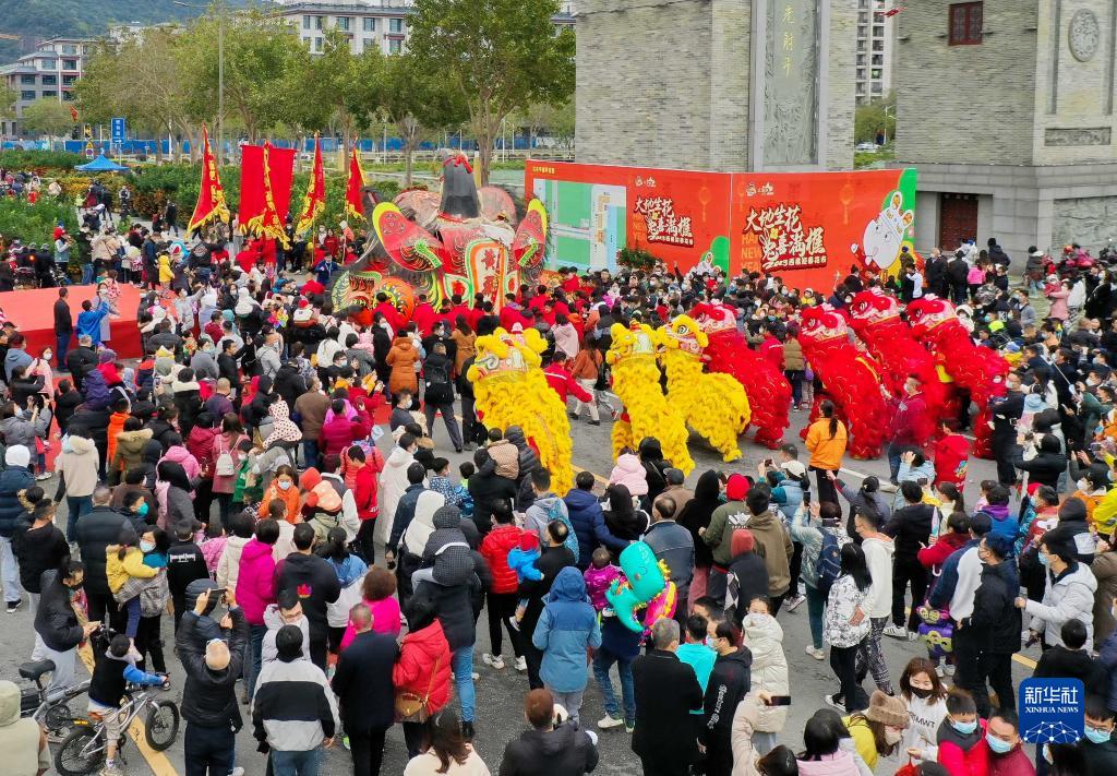 1月15日,高4.68米、寬4.5米的“獅王”獅頭領(lǐng)著(zhù)一群“醒獅”在西樵山牌坊開(kāi)始巡游(無(wú)人機照片)。