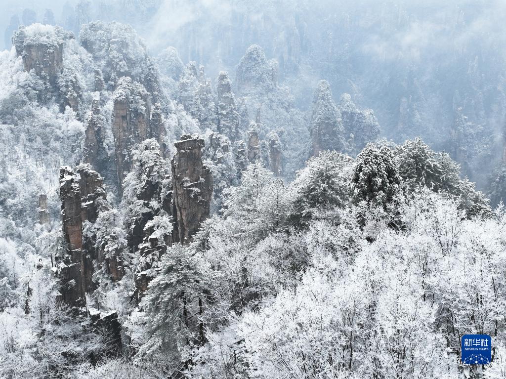 當日,位于湖南張家界的天子山被冰雪覆蓋,峰林銀裝素裹,美如畫(huà)卷。