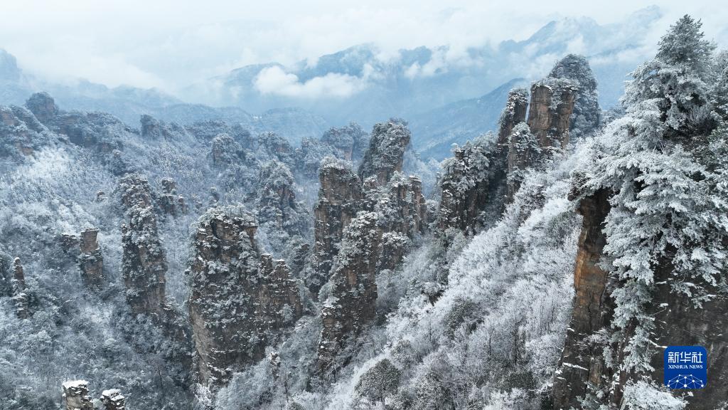 當日,位于湖南張家界的天子山被冰雪覆蓋,峰林銀裝素裹,美如畫(huà)卷。