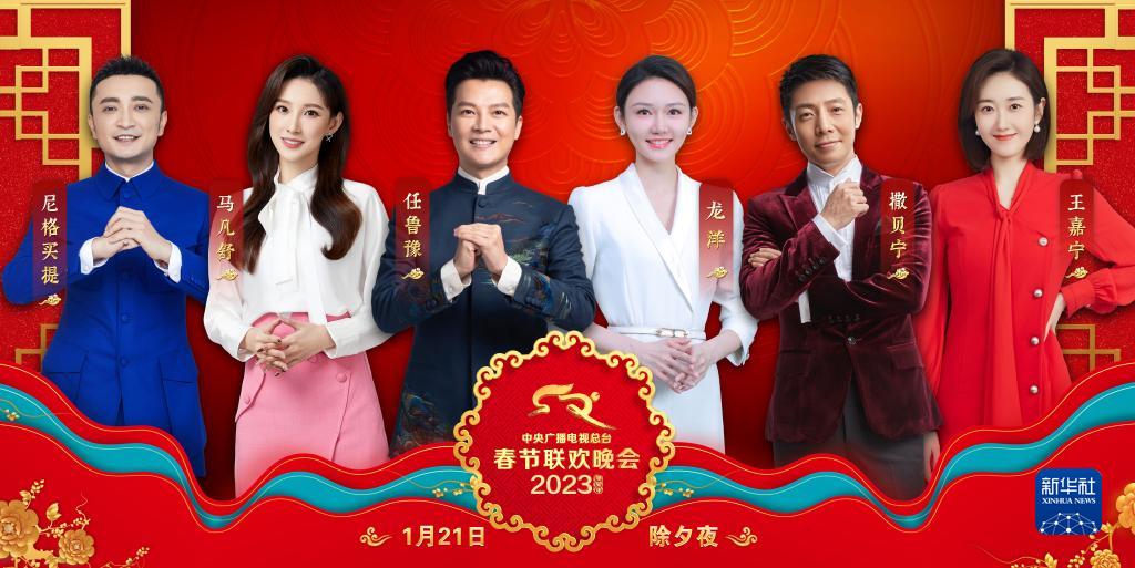 2023年春晚主持人陣容公布:任魯豫、撒貝寧、尼格買(mǎi)提、龍洋、馬凡舒、王嘉寧。這是宣傳海報。