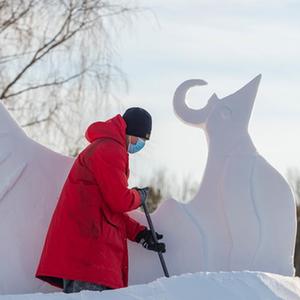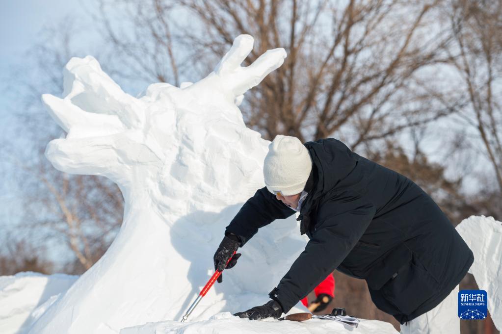 1月16日,在哈爾濱太陽(yáng)島雪博會(huì )園區,參賽選手在進(jìn)行雪雕創(chuàng )作。
