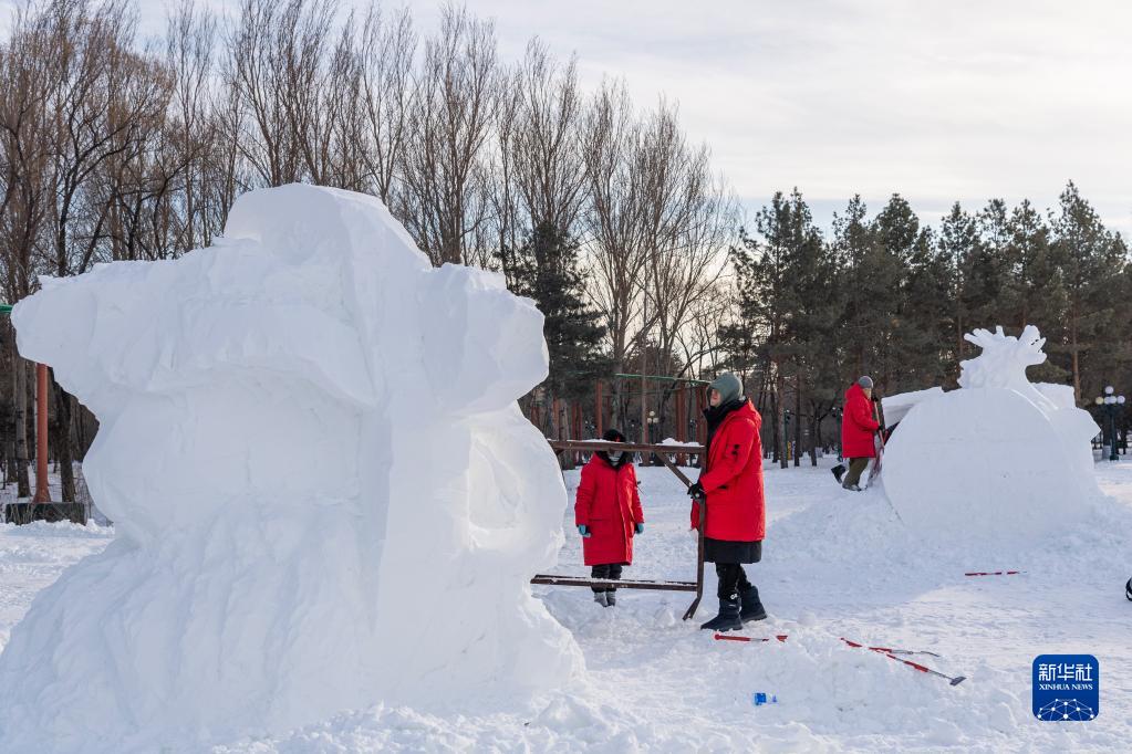 1月16日,在哈爾濱太陽(yáng)島雪博會(huì )園區,參賽選手在進(jìn)行雪雕創(chuàng )作。