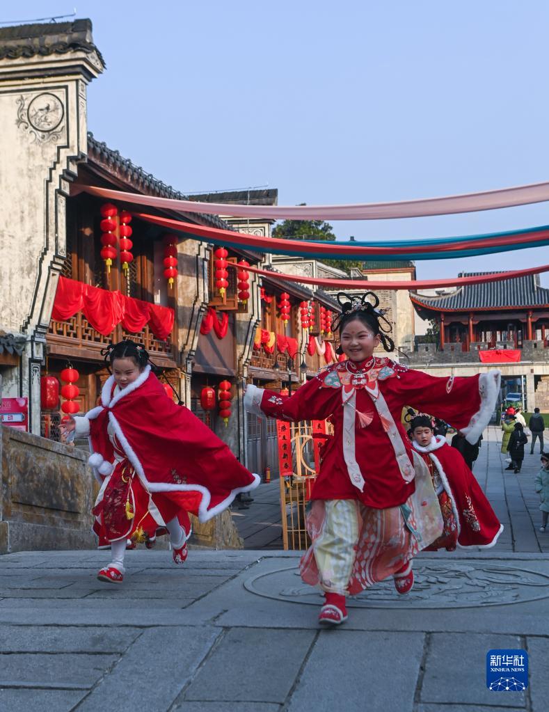 1月16日,身著(zhù)傳統服飾的孩子在新登鎮宋韻文化特色街區嬉戲。