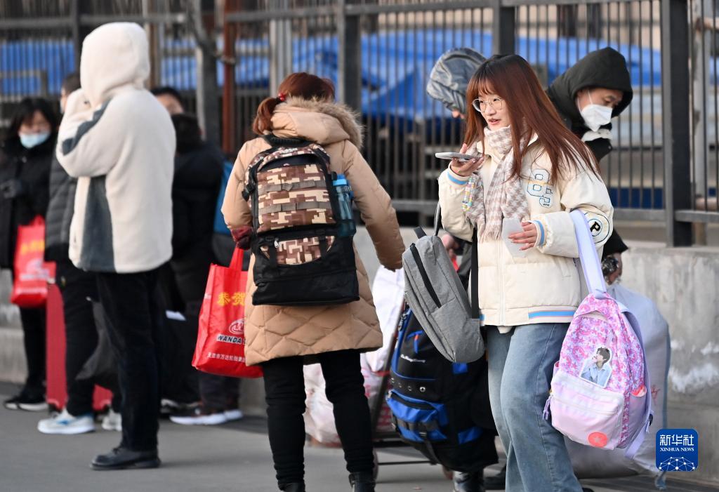 1月16日,返鄉工人在天津市北辰區宜興埠鎮等待車(chē)輛到達。