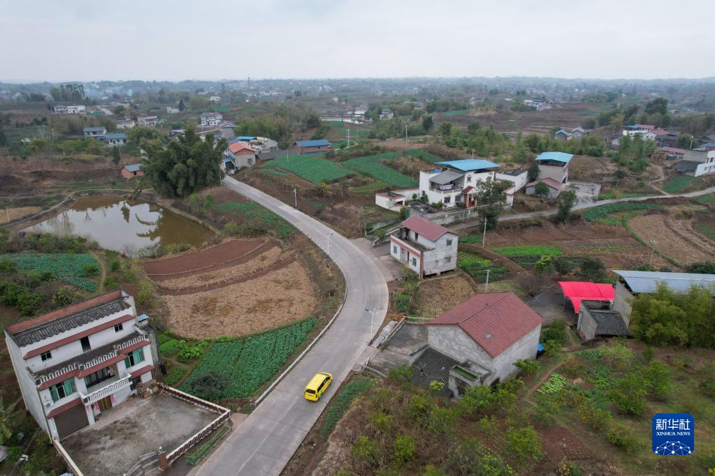 1月15日,“金通工程”小黃車(chē)行駛在四川自貢市富順縣鄉道上(無(wú)人機照片)。
