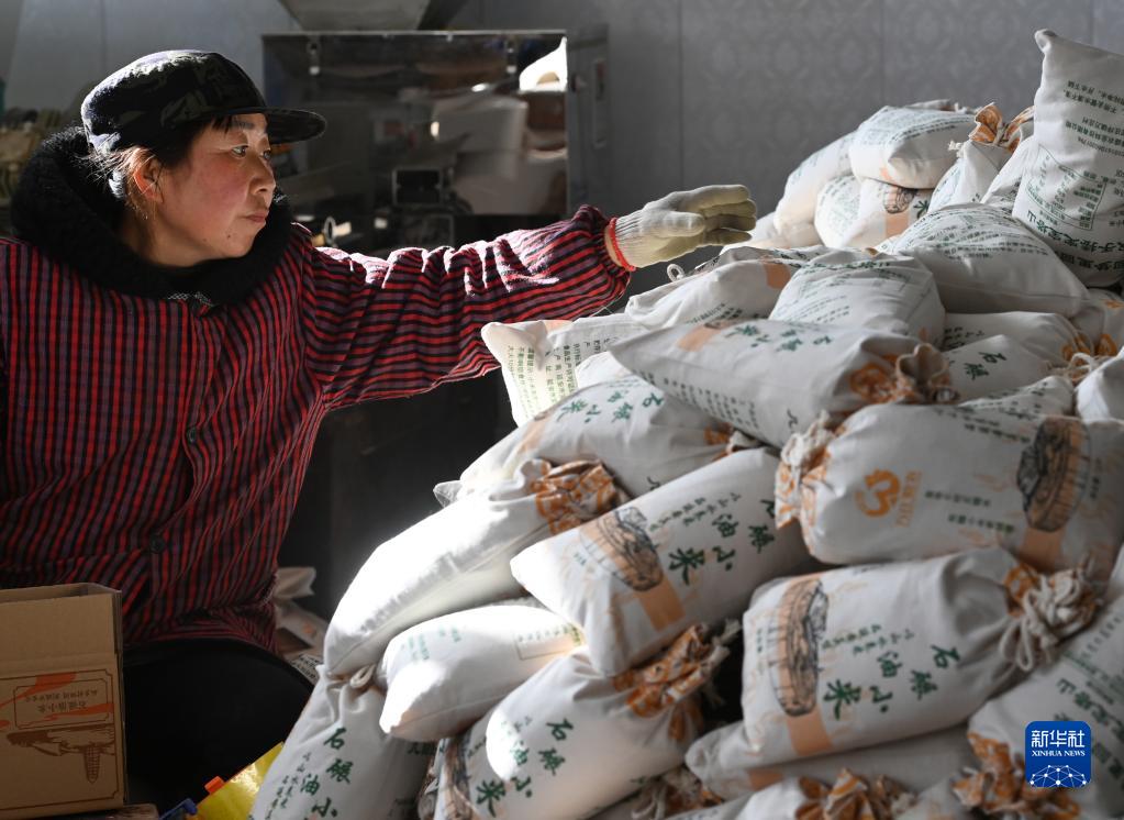 1月15日,陜西延安寶塔區河莊坪鎮一家農業(yè)科技有限公司的工人在倉庫包裝小米。