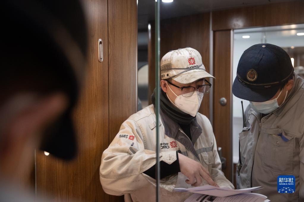 1月16日,工作人員在CR400BF-GZ型復興號高寒智能動(dòng)車(chē)組車(chē)廂內交流工作。