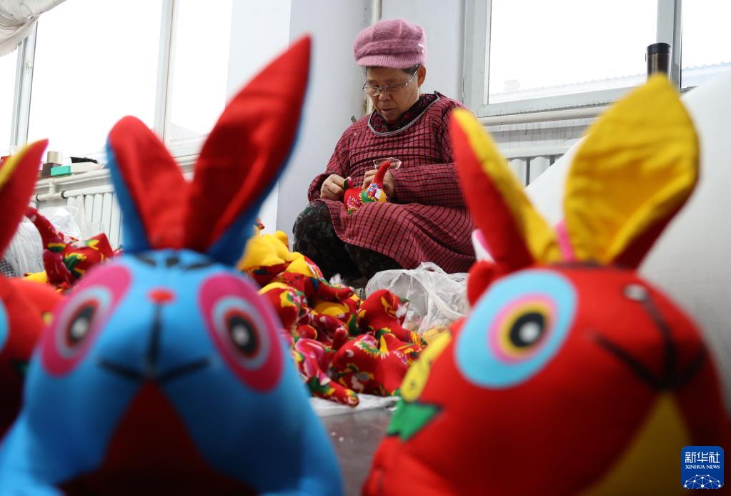 1月16日,手工藝人在山東省濱州市濱城區彭李街道的一家手工藝坊制作布藝兔。