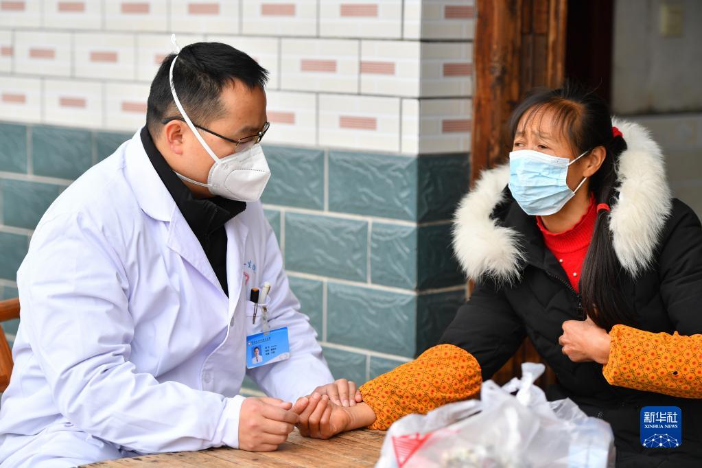 1月17日,在長(cháng)沙市望城區喬口鎮盤(pán)龍嶺村,醫護人員為有不適癥狀的村民把脈。