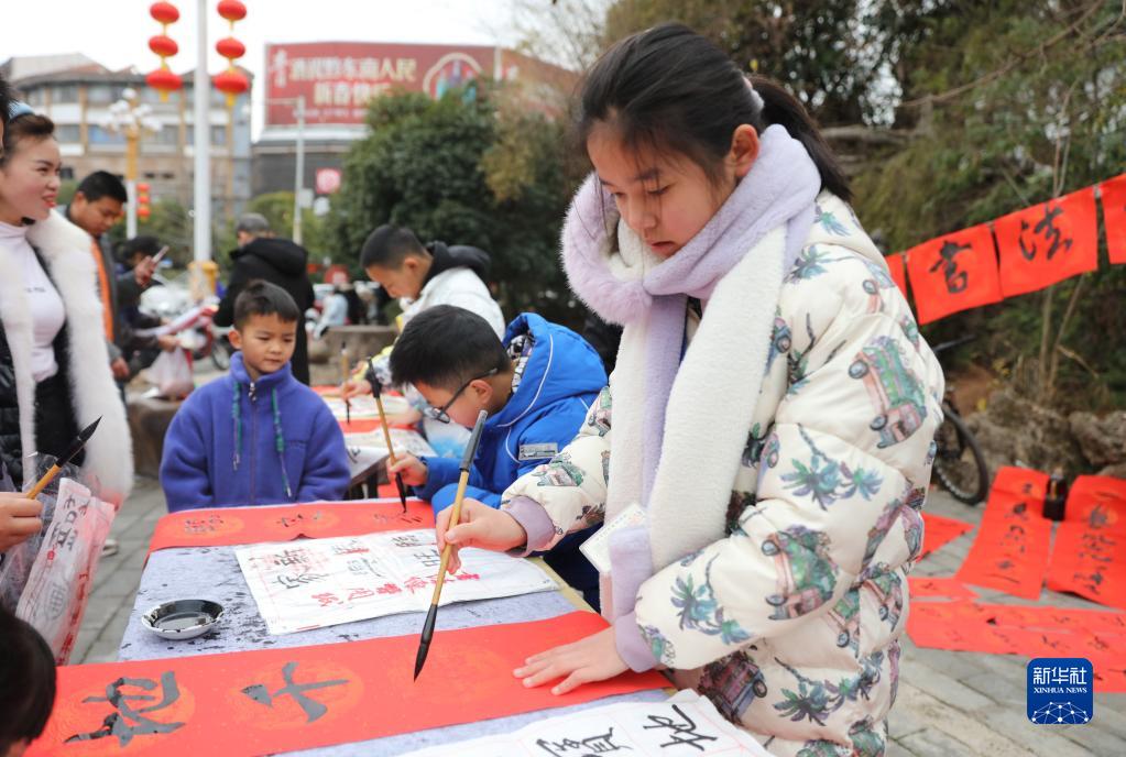 1月17日,在貴州省黔東南苗族侗族自治州施秉縣街心花園廣場(chǎng),小書(shū)法愛(ài)好者現場(chǎng)為群眾寫(xiě)春聯(lián)。