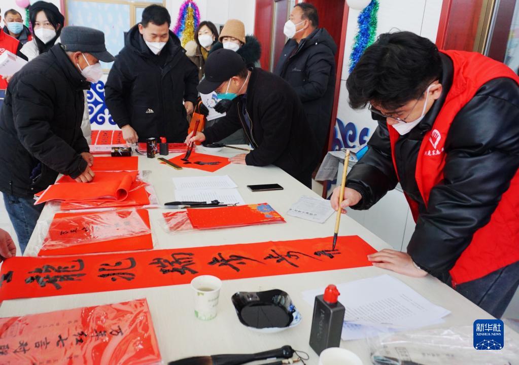 1月17日,甘肅省阿克塞哈薩克族自治縣組織開(kāi)展文化科技衛生“三下鄉”活動(dòng),書(shū)法愛(ài)好者為農牧民群眾寫(xiě)春聯(lián)。