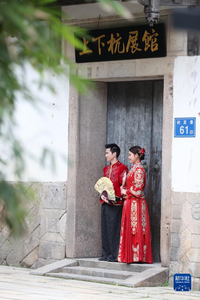 一對新人在福州上下杭歷史文化街區拍照(1月16日攝)。