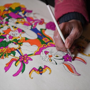 春節臨近,湖南省邵陽(yáng)市隆回縣灘頭鎮的木版年畫(huà)作坊加班加點(diǎn)趕制年畫(huà),供應春節市場(chǎng)。