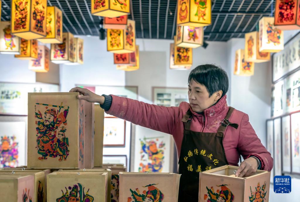 1月17日,在灘頭鎮福美祥年畫(huà)作坊,年畫(huà)藝人尹東香在擺放年畫(huà)燈籠。